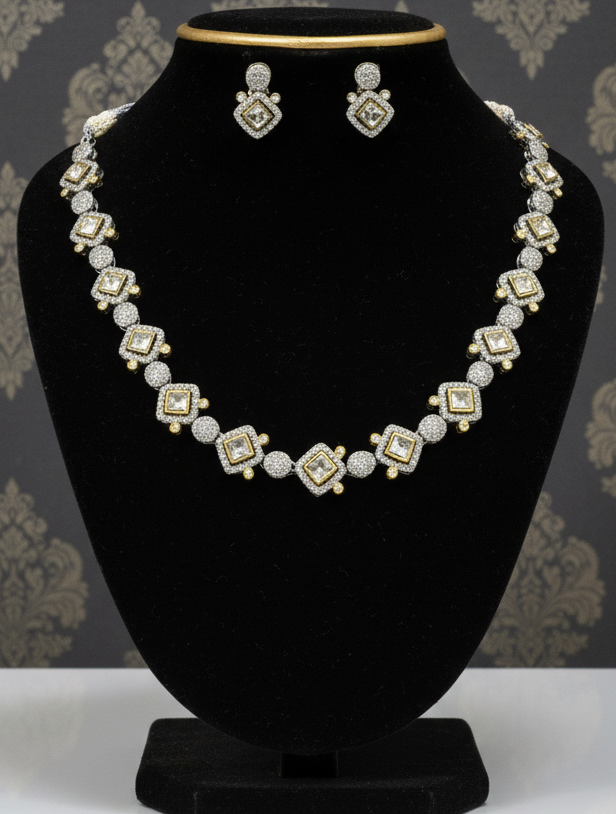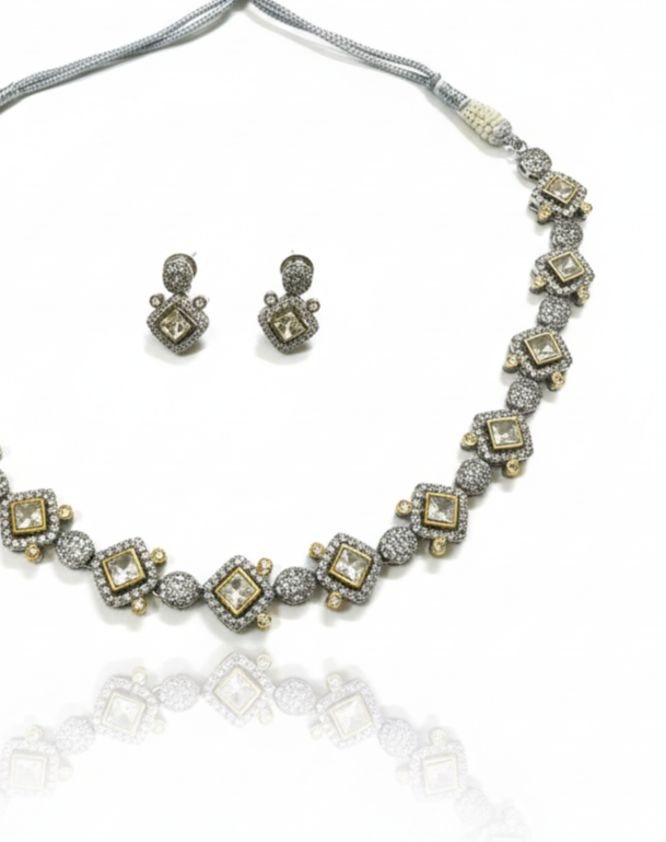 This meticulously detailed piece offers a continuous line of light, crafted for the modern individual who seeks bold sophistication. This versatile dual-tone metal palette makes it the perfect accompaniment to both contemporary evening wear and traditional festive attire. The set is beautifully completed with matching princess-cut studs that mirror the necklace’s captivating design.