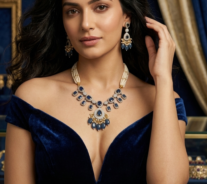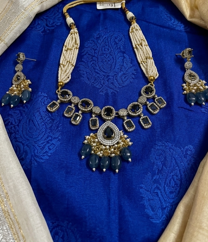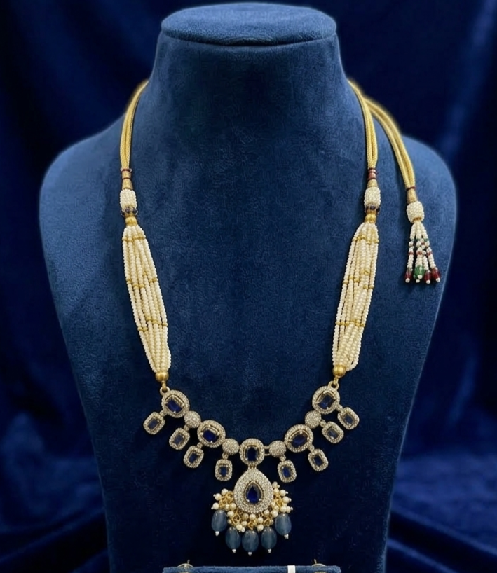 A majestic heritage-inspired necklace featuring multi-strand seed pearl bands connected to a stunning sapphire-blue stone centerpiece. Adorned with intricate silver-toned stonework and cascading blue bead drops, this piece is the epitome of royal grace and classic craftsmanship.