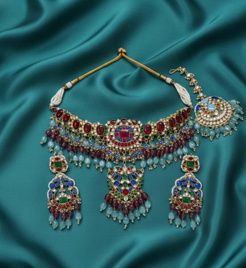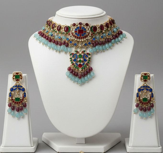 The piece is brought to life by a symmetrical arrangement of shimmering crystalline florets that lead the eye to a grand, multi-tiered focal pendant. The pendant is anchored by a magnificent pear-cut royal blue stone, adding a sense of fluid movement and regal presence to the silhouette. The set is perfectly completed with matching tiered drop earrings that mirror the necklace’s bold geometry and vibrant palette, offering a cohesive and majestic aesthetic. Crafted for the modern connoisseur of heritage jewelry, this suite is an ideal choice for high-profile weddings and grand festive receptions.