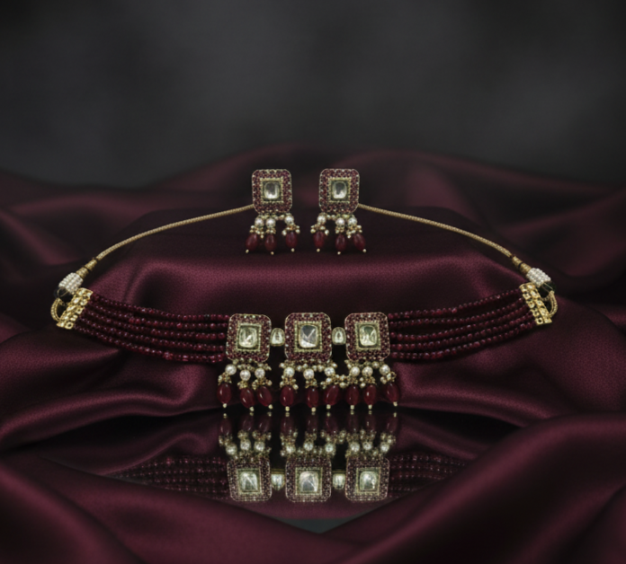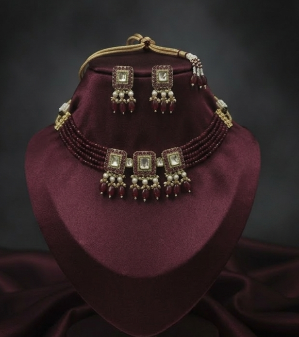 The Necklace: A majestic choker composed of seven parallel strands of tiny, faceted maroon seed beads. This dense beadwork provides a flexible and comfortable fit that contours perfectly to the neck. The choker is anchored by three prominent rectangular plaques in a gold-toned finish. Each plaque features a central Polki (uncut diamond) stone framed by a halo of deep maroon micro-enamel or stones. The plaques are finished with a delicate fringe of white seed pearls and dangling maroon teardrop beads.
