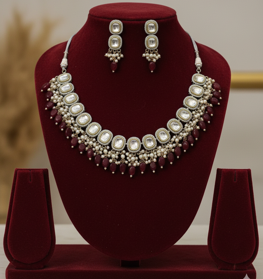 • The Earrings: Matching square-shaped studs that mirror the primary motif of the choker. They feature a central rectangular Kundan stone and are finished with a coordinating seed pearl and bead drop for a complete, cohesive look.