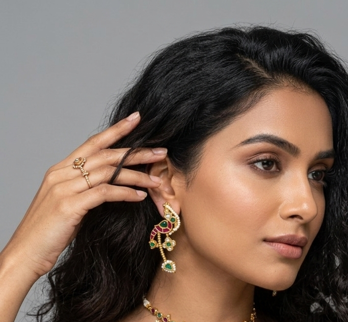 Infuse a touch of nature-inspired elegance into your jewelry collection with these exquisite Bird Motif Stud Earrings. Crafted with a rich gold-toned finish, these earrings feature a graceful bird silhouette—reminiscent of traditional peacock or parrot designs—intricately inlaid with vibrant ruby red and emerald green stones. The piece is further accented with a delicate border of tiny white seed pearls and a dainty floral drop, showcasing a beautiful blend of South Indian temple jewelry aesthetics and contemporary craftsmanship. Lightweight yet visually striking, these earrings are the perfect accessory for festive occasions, ethnic wear, or traditional celebrations.