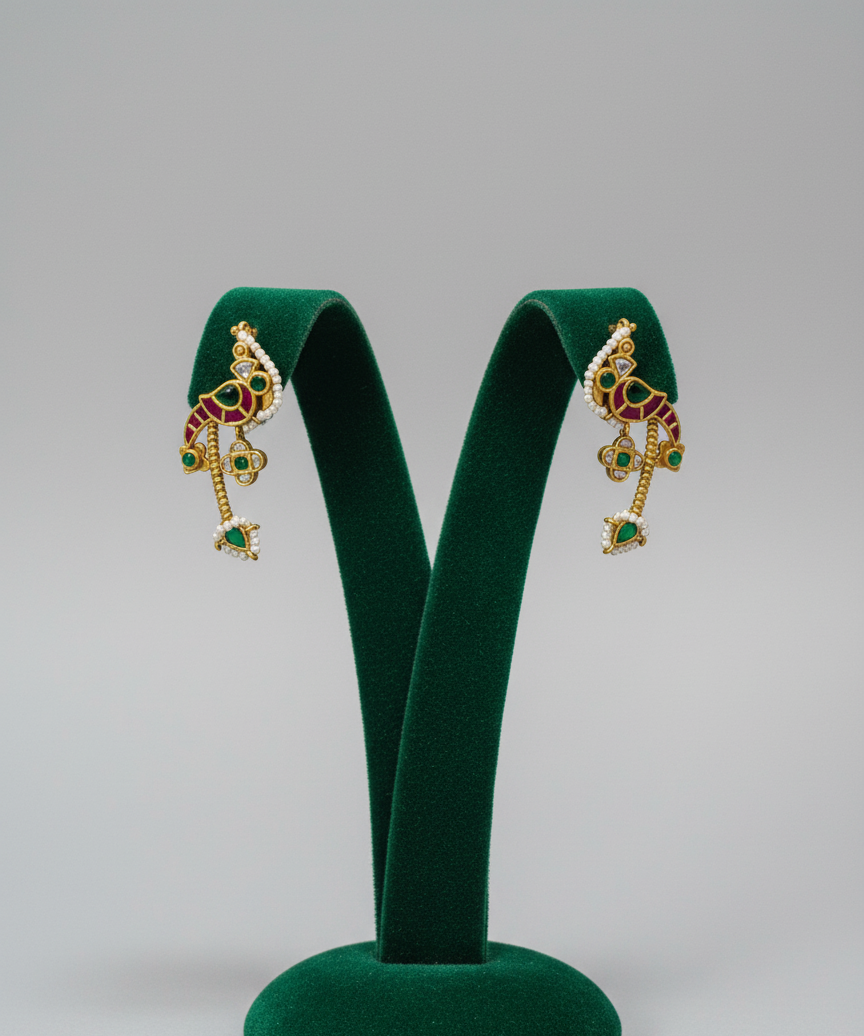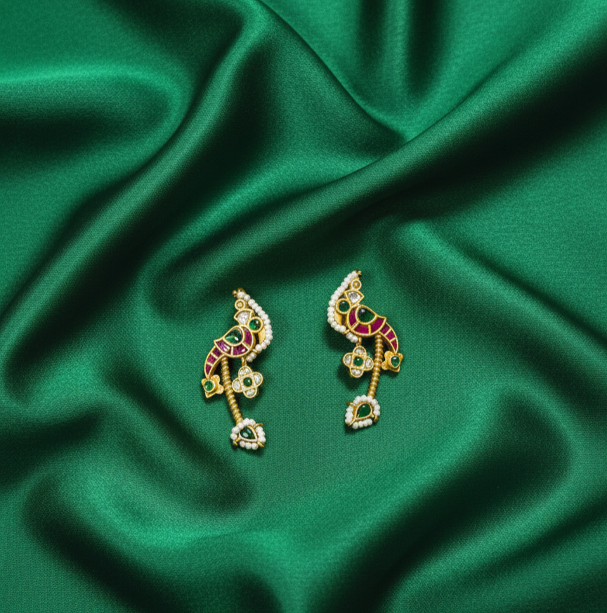 Elegant gold-finish bird motif earrings featuring classic ruby and emerald stone inlays with delicate pearl bead detailing. A charming heritage-inspired design that adds a regal touch to any traditional attire.