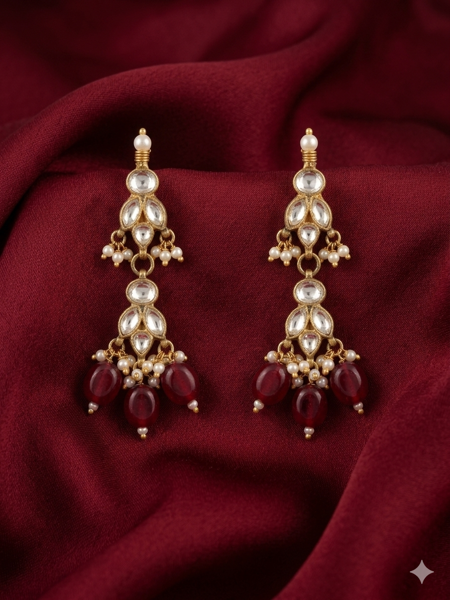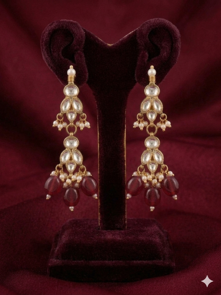 • Embellishments: The upper tier is accented with tiny pearl clusters (jhumki style), while the bottom tier is finished with three bold, oval-shaped maroon beads. These deep red accents provide a striking contrast to the gold-toned base.