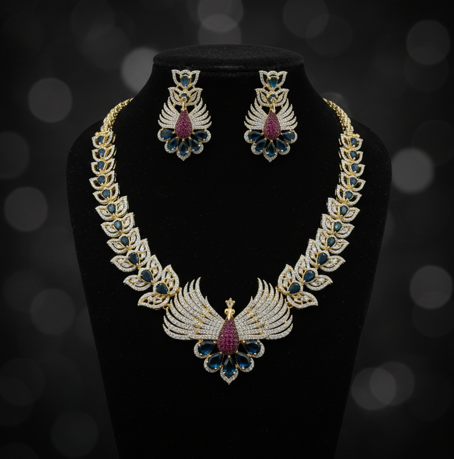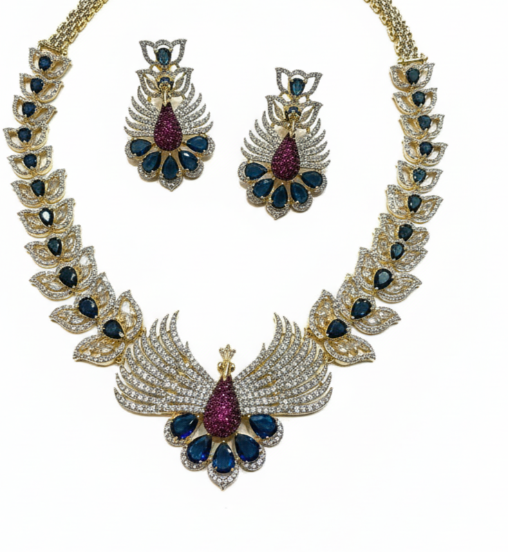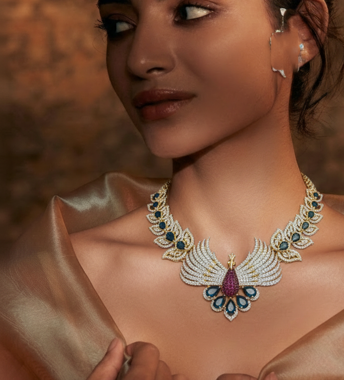A breathtaking masterpiece featuring an intricate peacock-inspired centerpiece with vibrant ruby-red and sapphire-blue accents, framed by a cascading wing-motif collar.