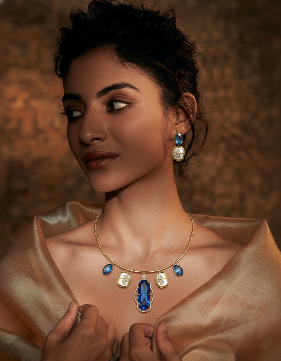 Command the room with the Imperial Phoenix Set, a celebration of heritage luxury and avian grace. This high-jewelry suite centers on a magnificent peacock motif, its body encrusted with deep ruby-red stones and its tail feathers unfurling into a fan of rich sapphire-blue droplets.