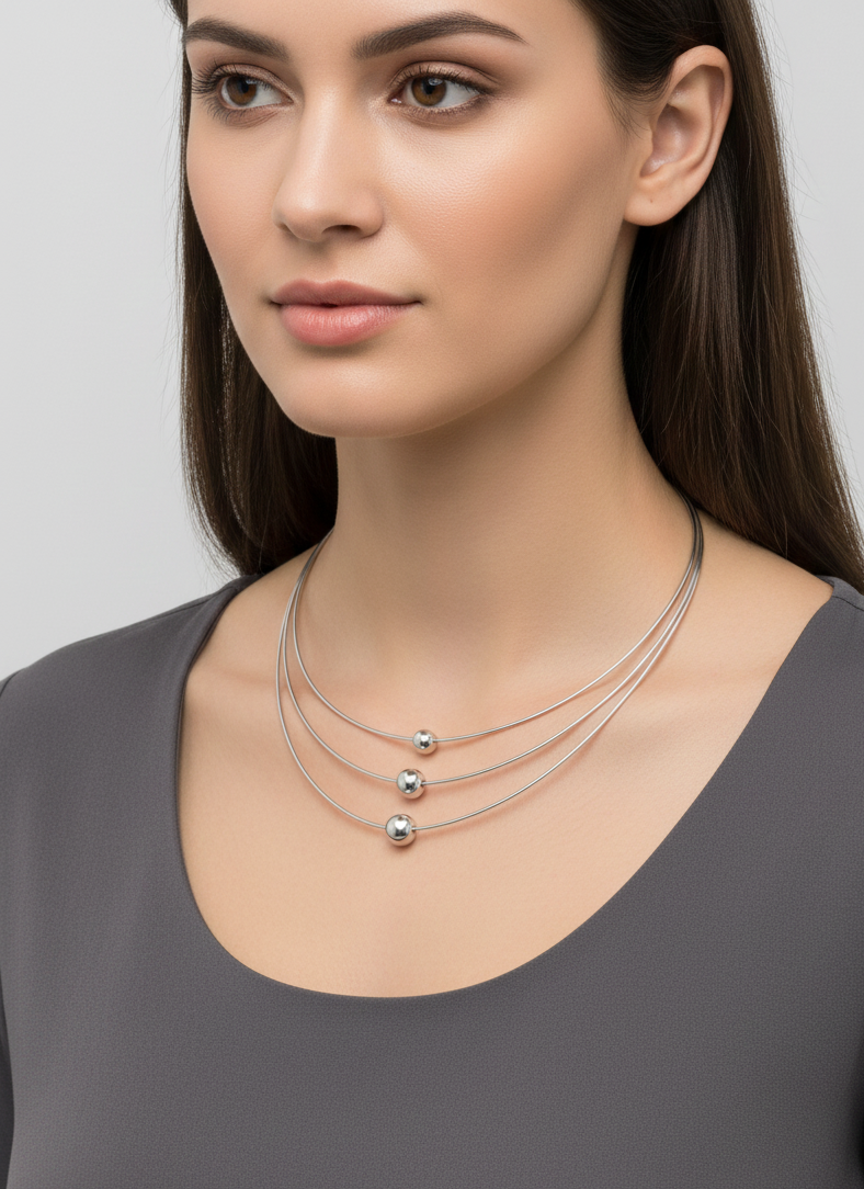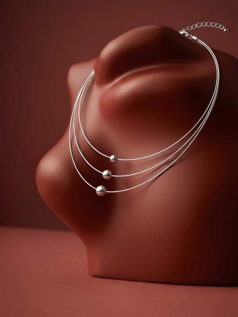 This elegant triple-layer choker necklace is crafted from premium stainless steel, offering both durability and a high-shine modern look. The design features three polished round beads placed on sleek, delicate wires that rest beautifully on the neckline. Its minimalist style makes it ideal for women who prefer classy and subtle accessories that match both western and Indo-western outfits. Lightweight and skin-friendly, this necklace is perfect for daily wear, office use, photoshoots, parties, and gifting. The adjustable chain ensures a comfortable and secure fit for all neck sizes. A perfect accessory to elevate any simple outfit with a chic, contemporary touch.