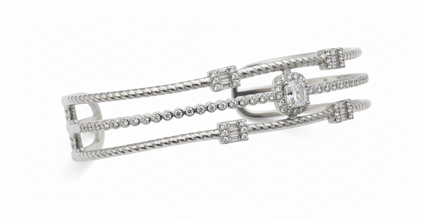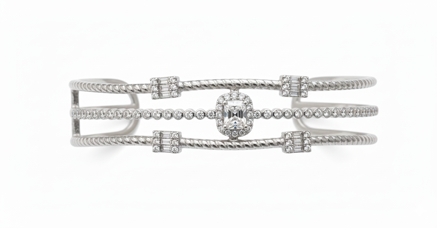 A luxurious silver bracelet featuring a triple-line design with sparkling diamond-style stones and a refined central accent.