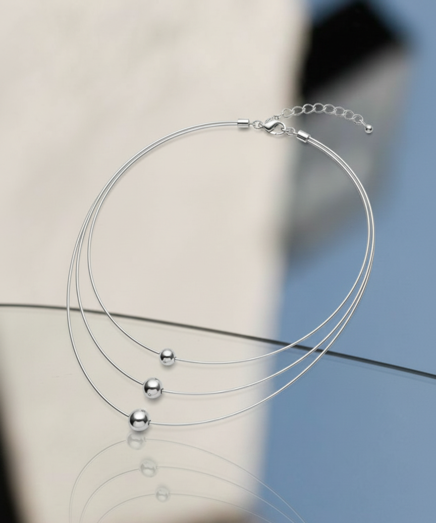 A modern, multi-layered silver-toned choker featuring three delicate wire strands accented with polished metallic beads for a sleek, tiered look.