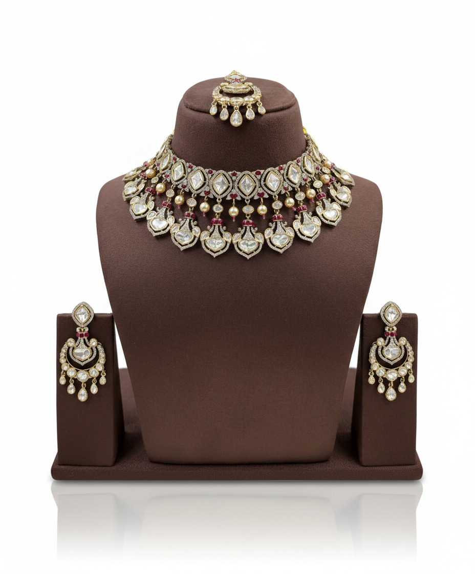 The Vasundhara Emerald Temple Choker Set is a magnificent expression of heritage elegance and artisanal craftsmanship. This statement choker features intricate temple-style motifs highlighted with multicolored stones, antique gold-toned detailing, and graceful emerald bead drops. Layers of tiny gold beads and delicate danglers add movement and regal charm to the design. The matching earrings mirror the ornate detailing, completing the ensemble with perfect harmony. Ideal for brides, weddings, and festive celebrations, this exquisite set pairs beautifully with silk sarees, bridal lehengas, and traditional attire, making it a timeless addition to any jewelry collection.