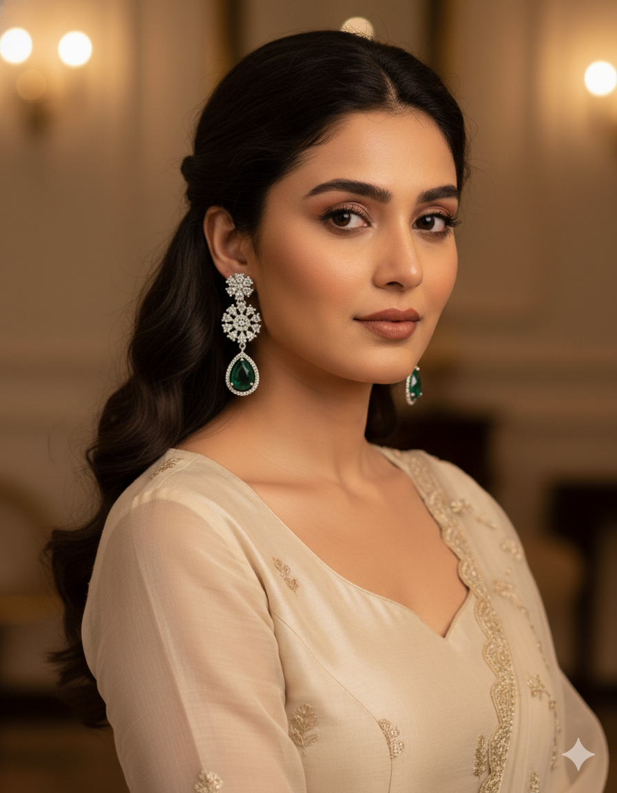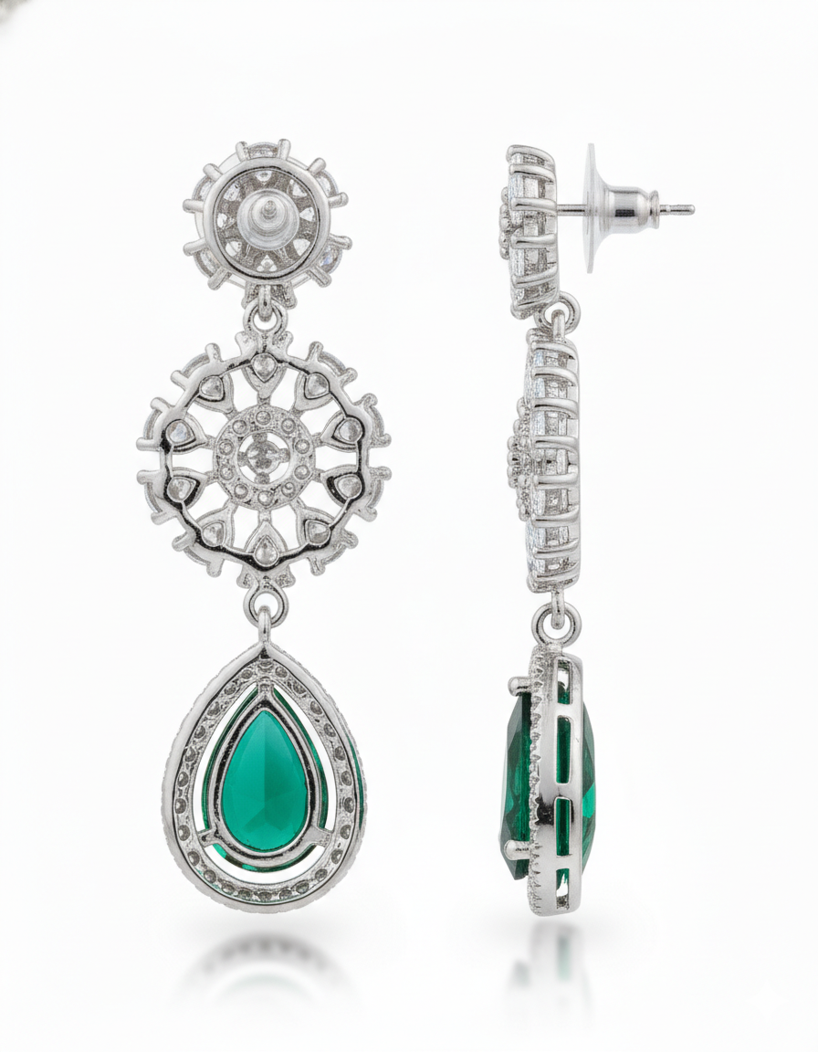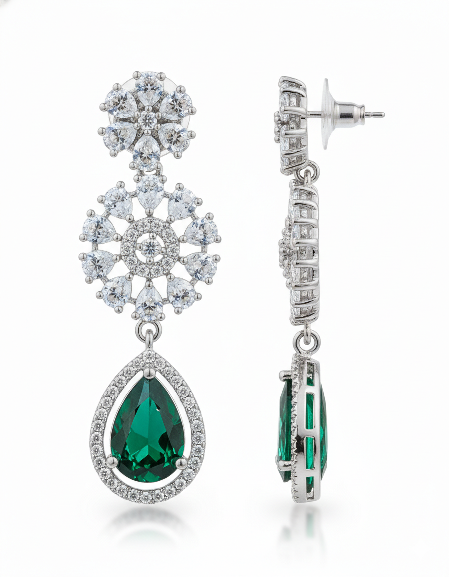 Bold yet exquisitely refined, the Verde Royale Drop Earrings are designed to captivate. Featuring a radiant emerald-green pear-shaped stone framed by shimmering pavé accents, these earrings are crowned with intricate floral and circular crystal motifs that add depth, brilliance, and graceful movement.