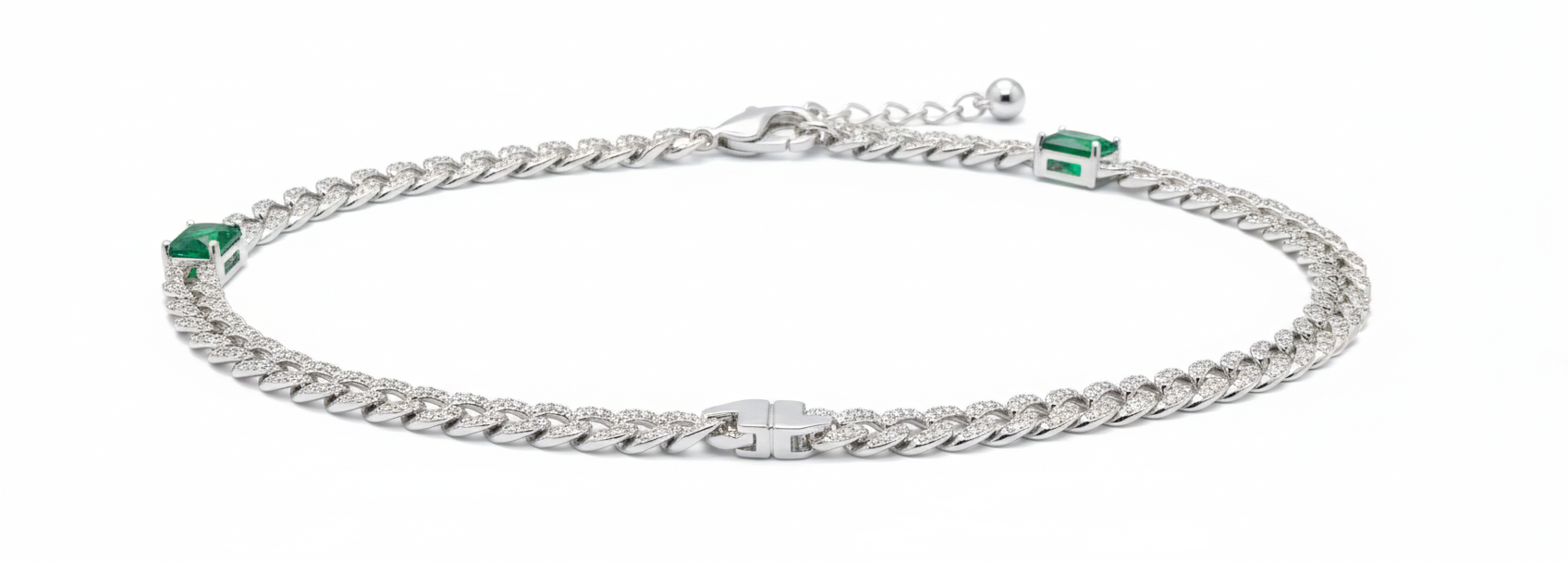 A glamorous silver-finish curb chain choker adorned with brilliant pavé-set stones and two radiant emerald-cut green accents. A bold statement piece that blends urban edge with timeless elegance.
