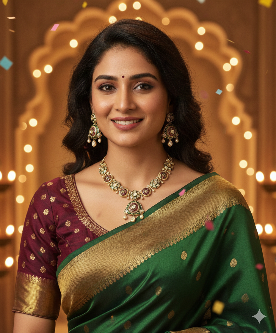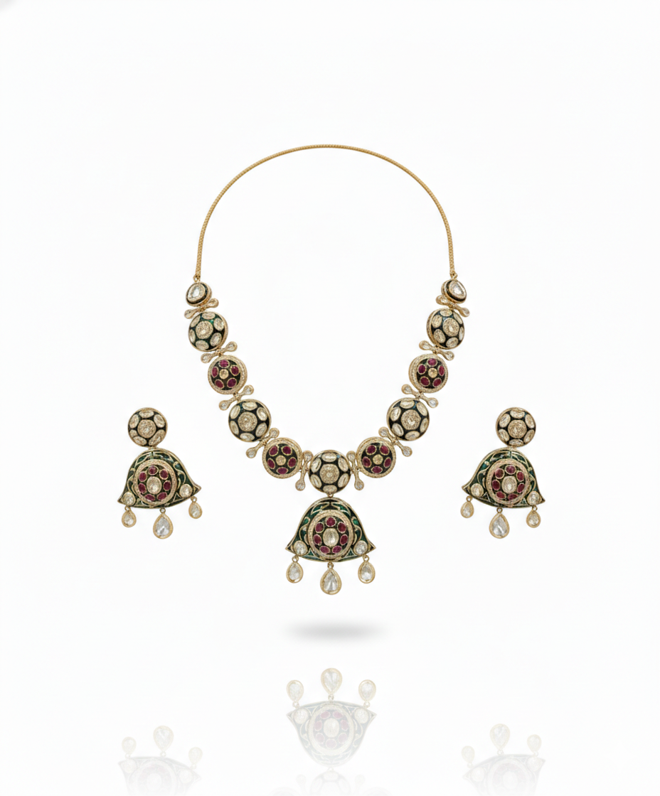 Transport yourself to the era of royalty with this masterfully crafted Meenakari set. The necklace features circular medallions detailed with traditional dark green enamel and ruby-red accents, all centered around shimmering Polki-style stones. The centerpiece is a magnificent bell-shaped (Jhumka style) pendant adorned with teardrop Polki dangles that add graceful movement. Complete with matching statement earrings, this set is an exquisite choice for heritage weddings and traditional festive celebrations.