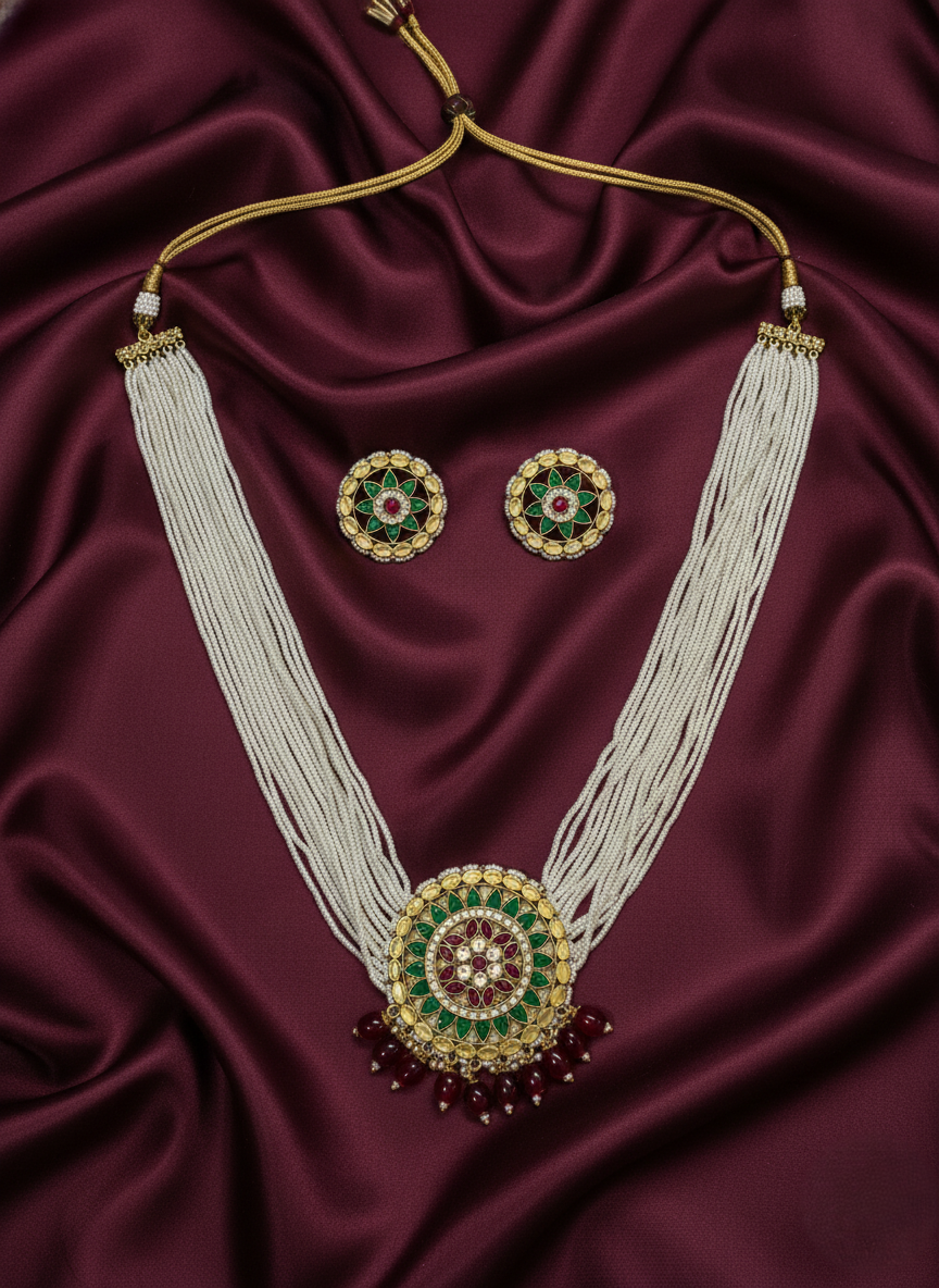 A majestic long-necklace set featuring a large, circular gold-plated medallion intricately set with emerald and ruby-toned stones. Suspended from multiple strands of delicate seed pearls and paired with matching floral studs, this set is a masterpiece of vintage royal elegance.