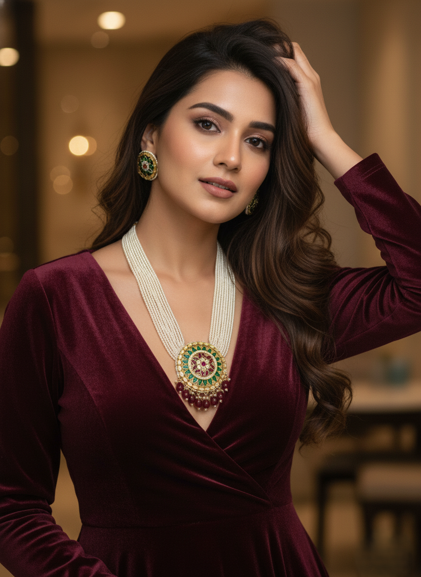 Styling Tip: This set is a perfect match for a heavy Banarasi saree, a silk Anarkali, or even a contemporary velvet gown. The contrast of the cream pearls against dark jewel tones like wine, navy, or forest green is particularly striking.