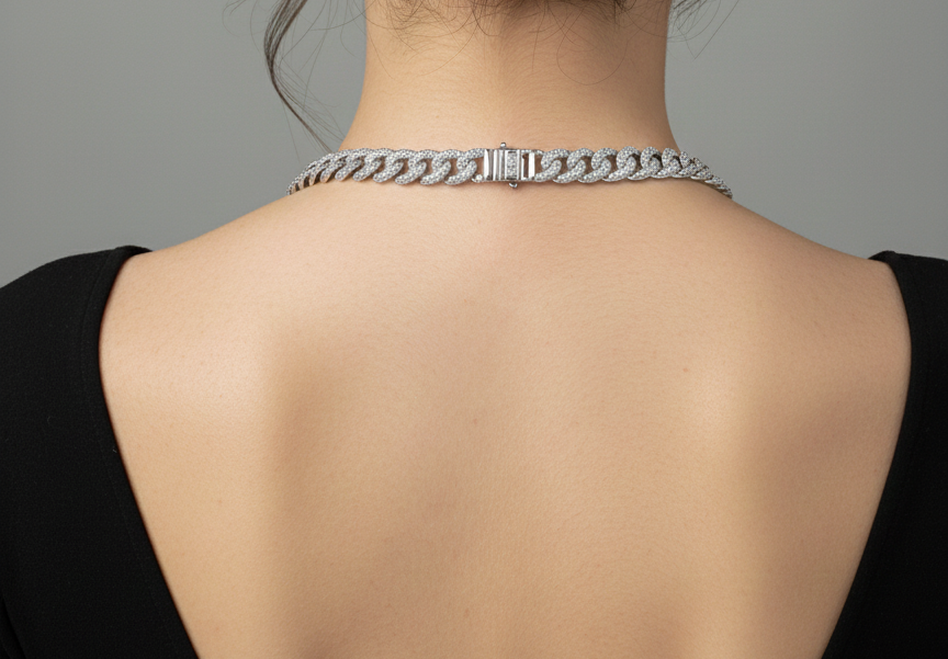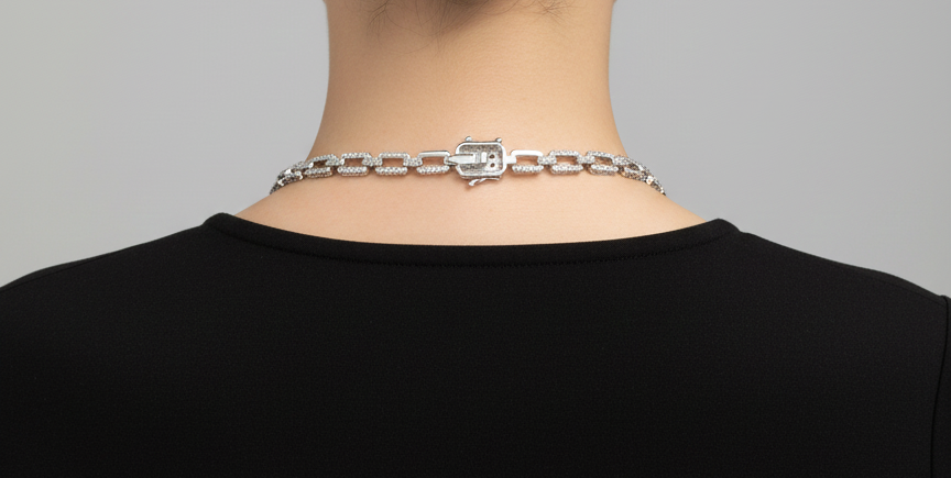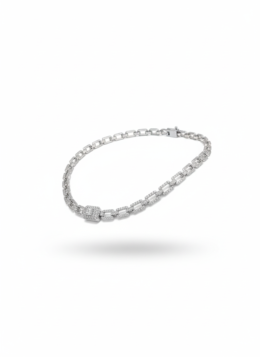 A sophisticated silver-finish paperclip chain necklace fully adorned with brilliant pavé-set stones. A bold, architectural piece that combines contemporary style with timeless sparkle.