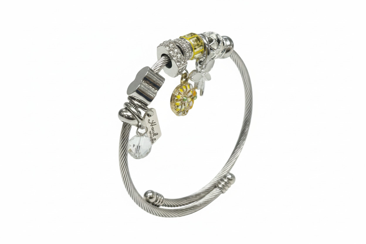 Artisan Charms: Features a vibrant assortment of dangling charms, including a yellow enamel sunflower, a silver-tone dragonfly, and a sparkling clear faceted crystal drop.