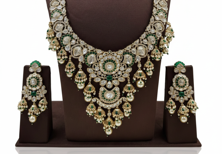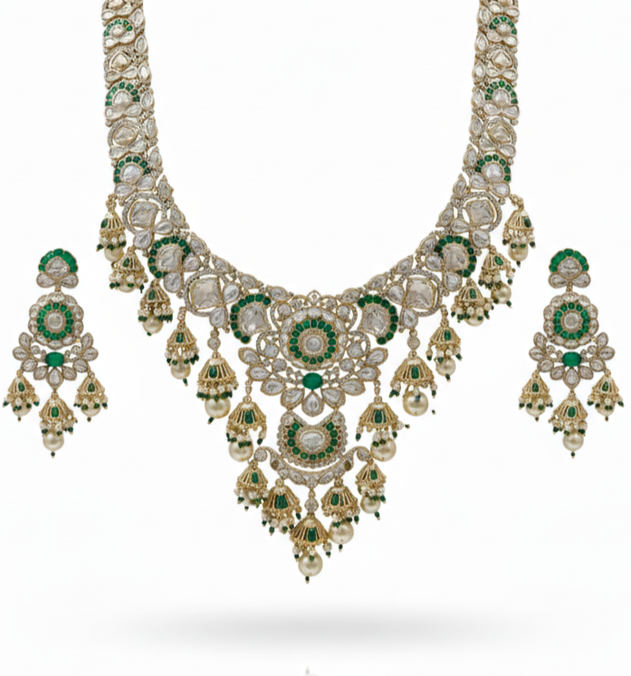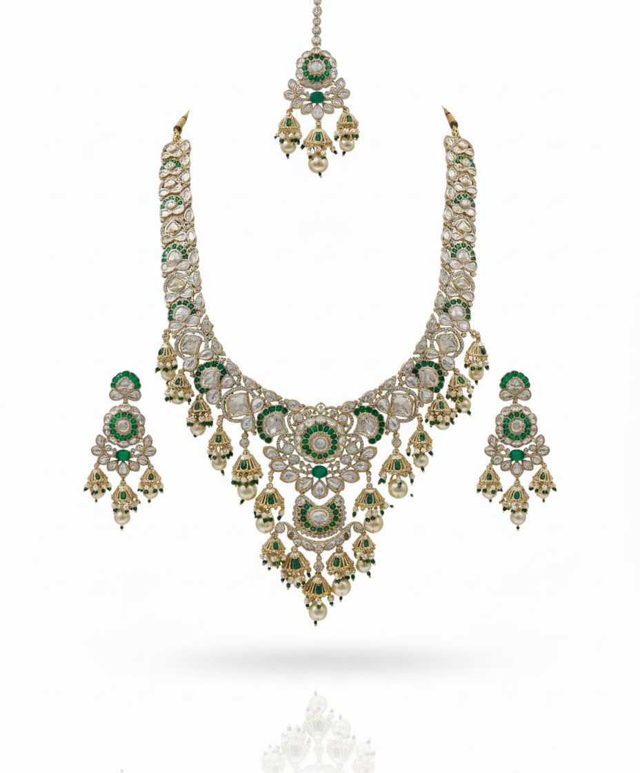 Zehra Emerald Polki Pearl Bridal Necklace Set